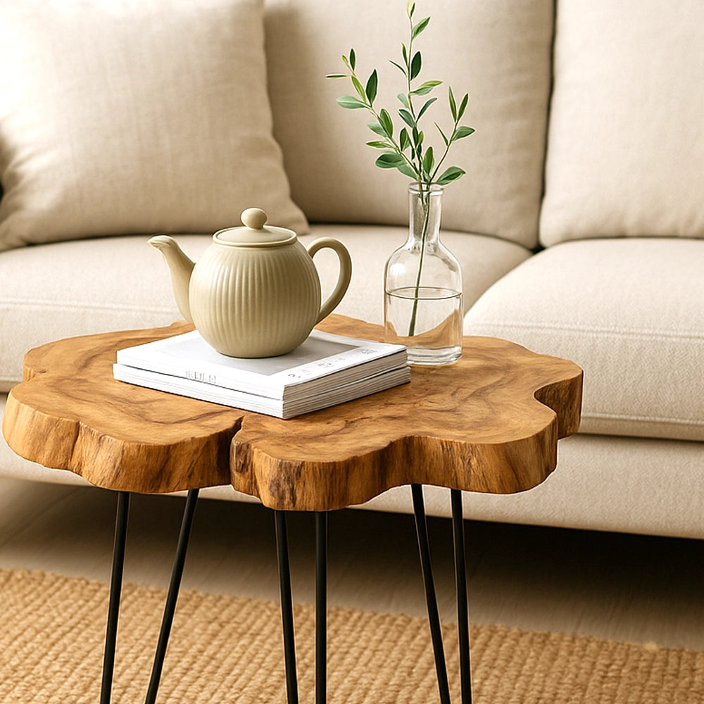 Naturgewachsenes Teakholz auf filigranem Eisen