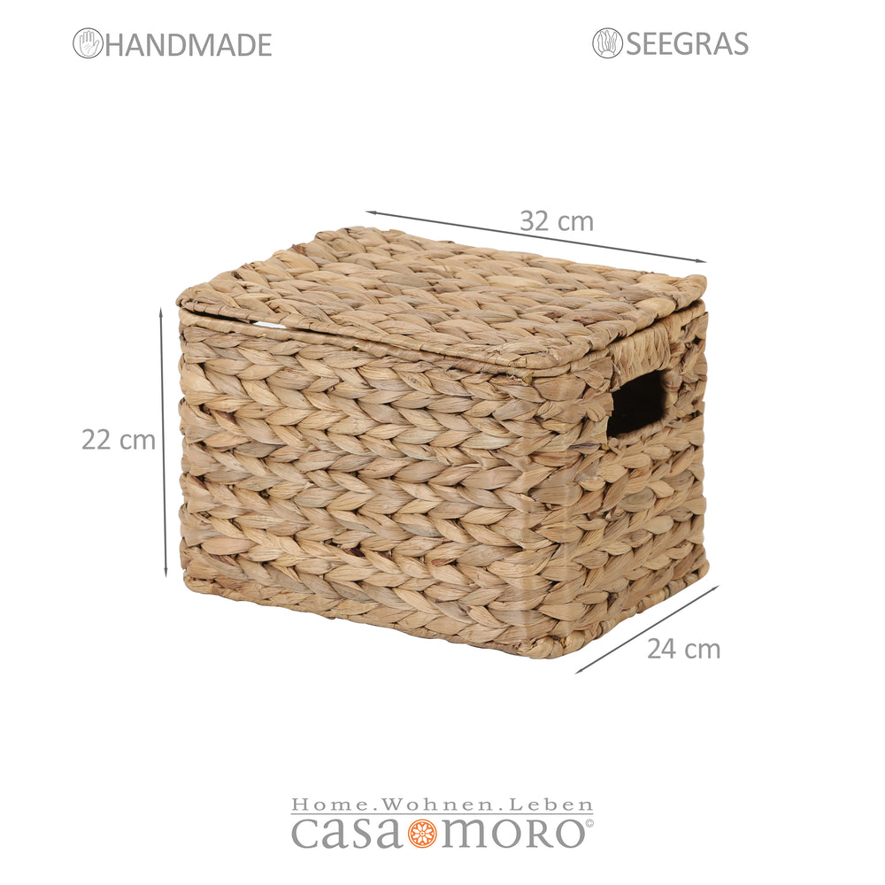 Mit praktischen Maßen von H 22 x B 32 x T 24 cm bietet die Flechtbox ausreichend Platz für verschiedenste Utensilien. Verwende die Aufbewahrungsbox zur sortierten Aufbewahrung von Kleidung, Büchern, Kosmetik (Make-up-Organizer) oder auch Obst und Gemüse. Der Deckel schützt den Inhalt vor Staub, während die stabilen Griffe ein leichtes Transportieren ermöglichen und das Umstellen erleichtern.