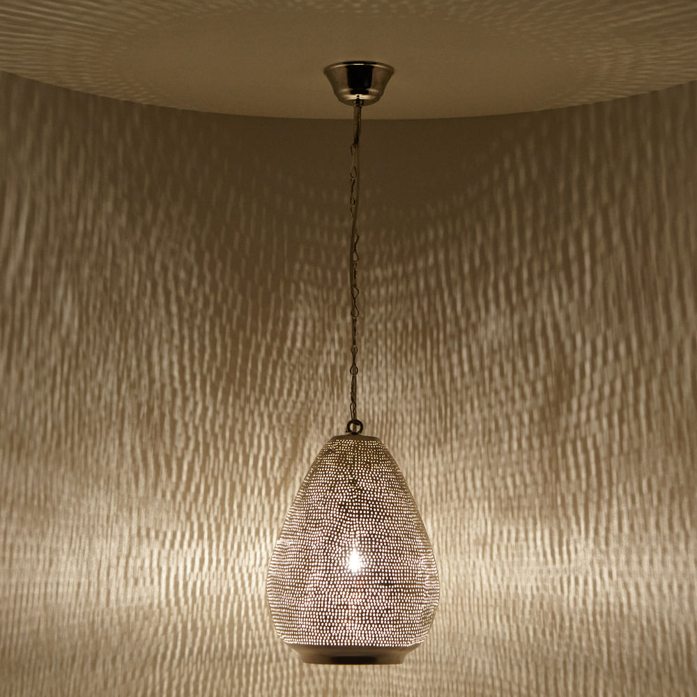 Die Hängelampe macht in jeder Ecke und in jedem Zimmer mit ihren verzaubernden Schattenwürfen eine gemütliche Atmosphäre! Ob über dem Esstisch , im Schlaf-oder Wohnzimmer, ob mediterran, orientalisch oder modern- mit unserer versilberten Ägyptischen Lampe begeben Sie sich auf eine Reise in den Orient und lassen sich verzaubern mit filigranen Schatten – ein Hingucker der in ihrem Wohnbereich nicht fehlen darf!