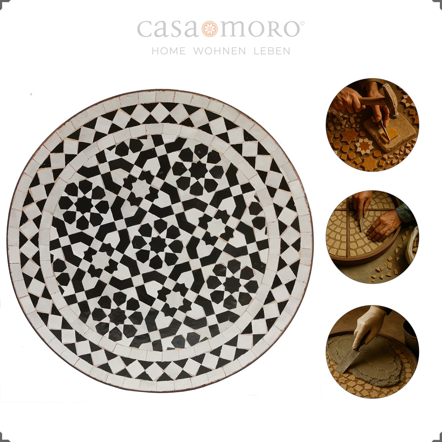 Dieser Mosaiktisch kombiniert orientalisch-grafische Ornamentik mit urbaner Zurückhaltung und moderner Monochromie. Ein runder Blickfang mit Stil für all jene, die Kontraste lieben und klare Linien schätzen.