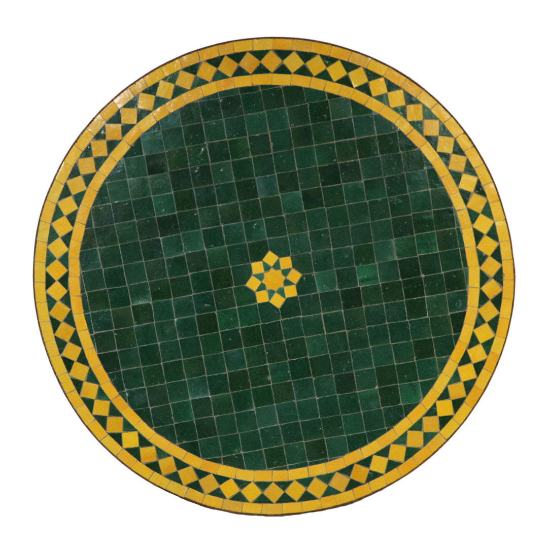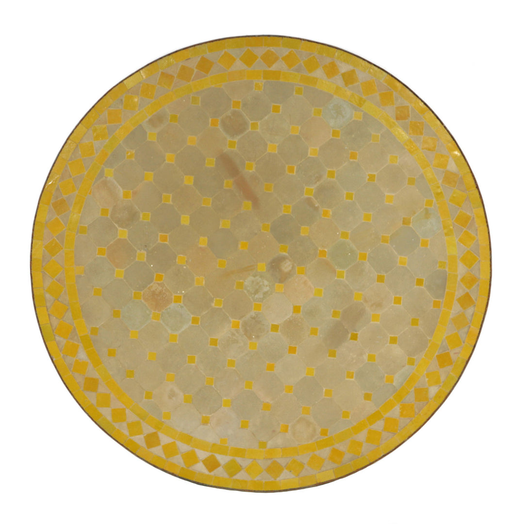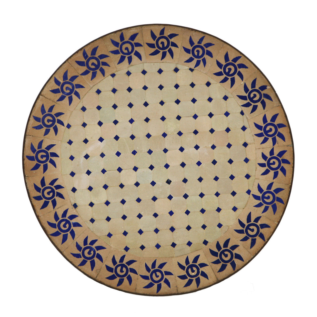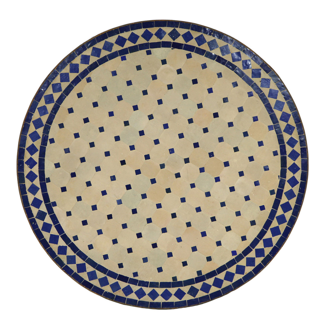 Bei Mosaiktischen wird die Tischplatte aus kunstvoll zusammengesetzten handgeschnittenen Fliesen auf einer stabilen Betonbasis gefertigt. Das Tischgestell ist meist aus handgeschmiedetem Eisen. Die Schmiedekunst, ebenfalls tief in der marokkanischen Tradition verankert, sorgt für robuste, langlebige Strukturen. Die handgefertigten Eisengestelle werden sorgfältig geformt, wobei oft dekorative, geschwungene Elemente eingebracht werden, die das feine Mosaikmuster der Tischplatte harmonisch ergänzen.