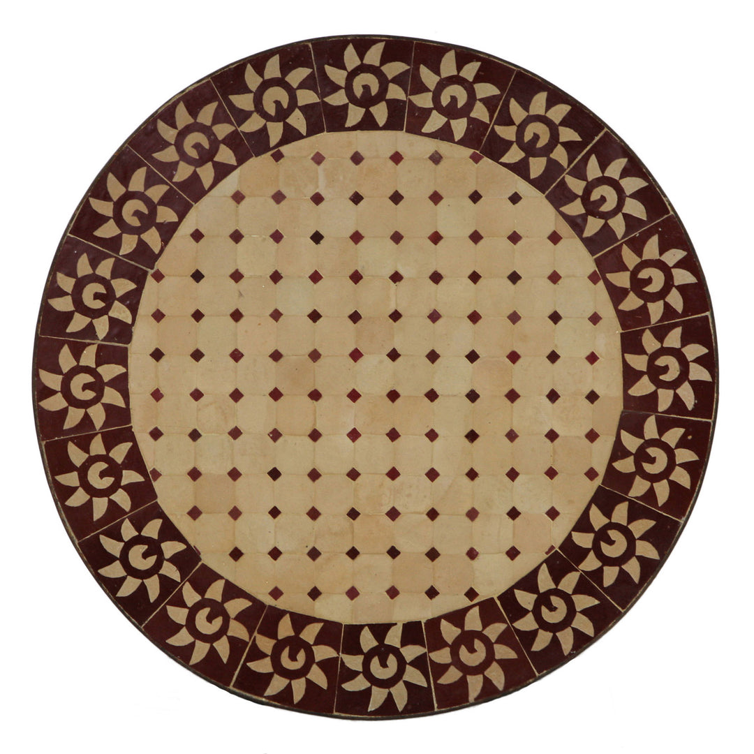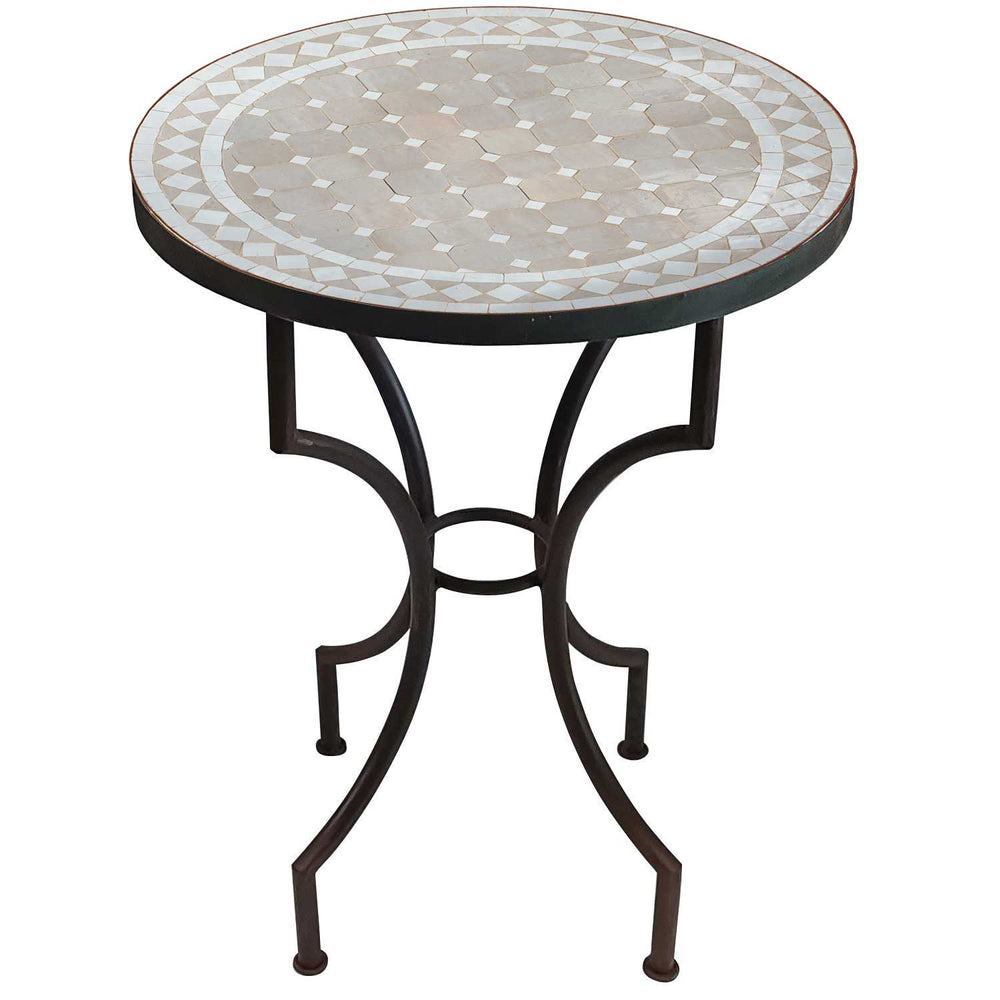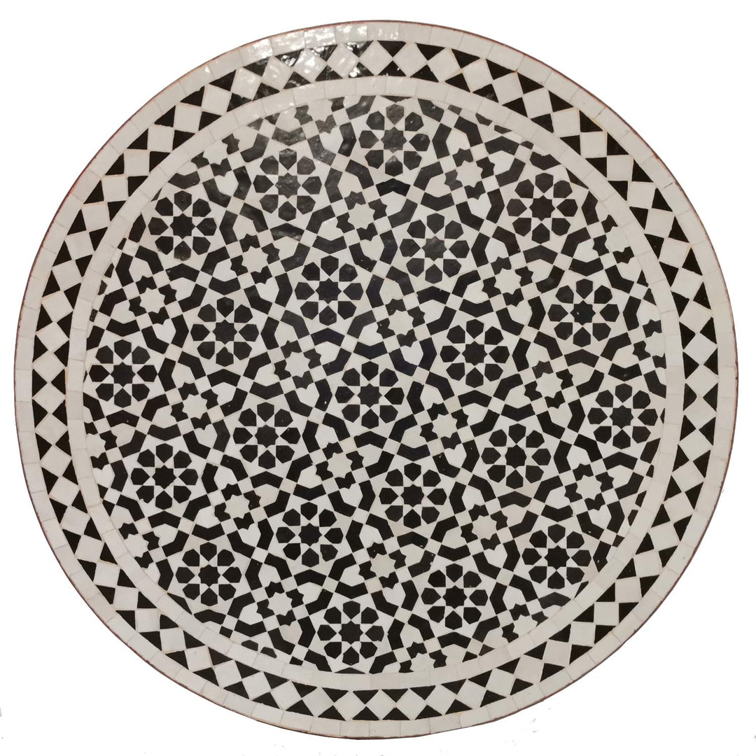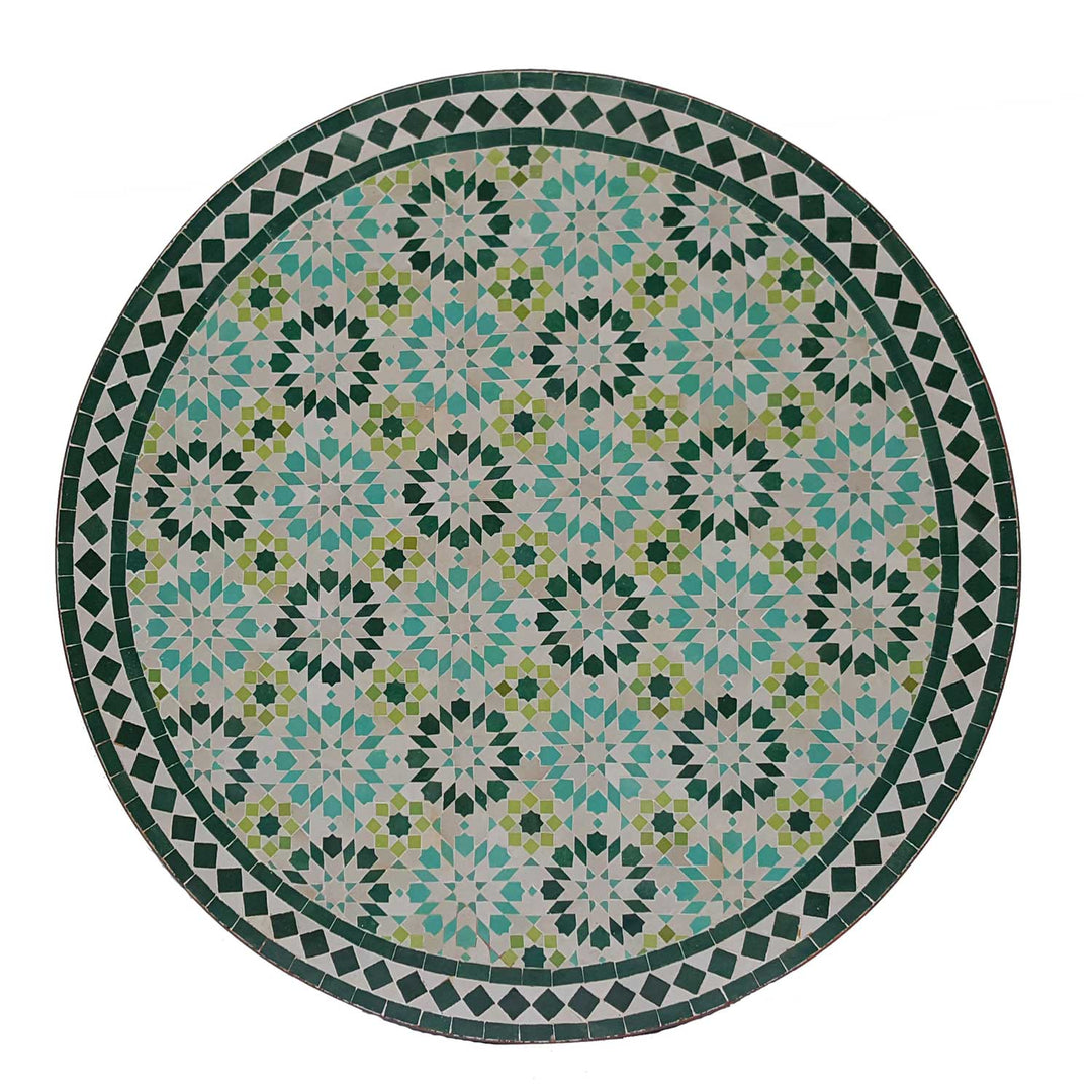 Bei Mosaiktischen wird die Tischplatte aus kunstvoll zusammengesetzten handgeschnittenen Fliesen auf einer stabilen Betonbasis gefertigt. Das Tischgestell ist meist aus handgeschmiedetem Eisen. Die Schmiedekunst, ebenfalls tief in der marokkanischen Tradition verankert, sorgt für robuste, langlebige Strukturen. Die handgefertigten Eisengestelle werden sorgfältig geformt, wobei oft dekorative, geschwungene Elemente eingebracht werden, die das feine Mosaikmuster der Tischplatte harmonisch ergänzen.
