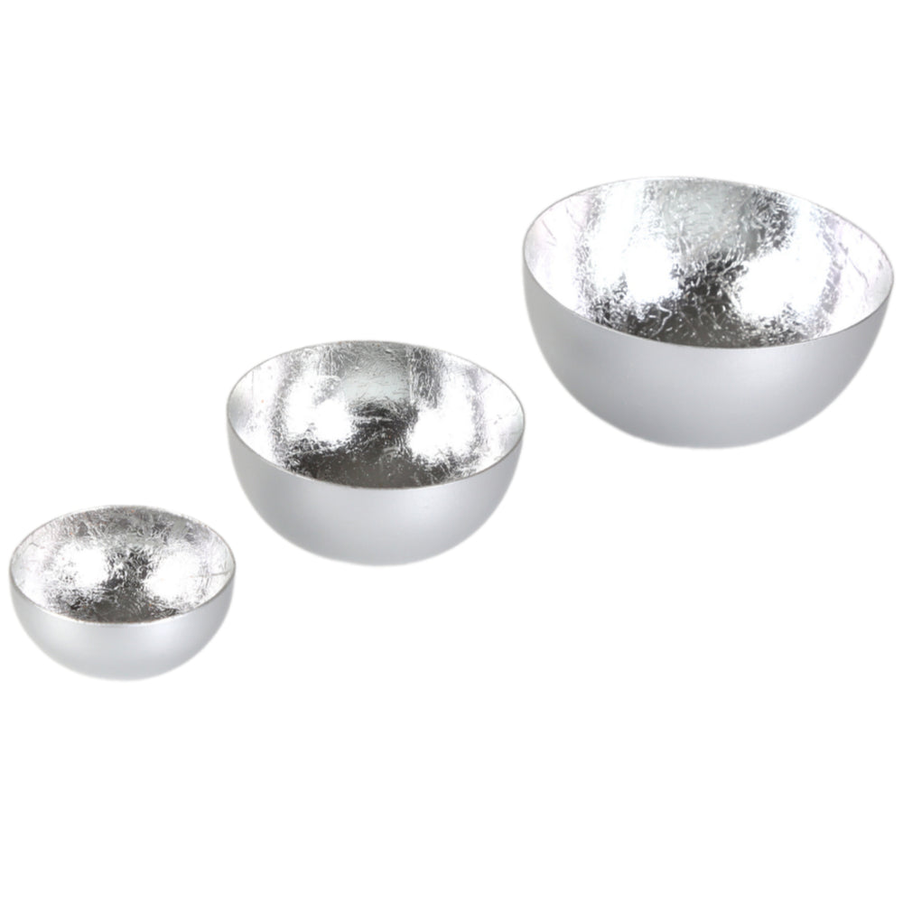 Silberne Schalen, glänzende Momente. Das elegante Set besteht aus drei unterschiedlich großen Teelicht-Schalen, die aus robustem Metall gefertigt und in sorgfältiger Handarbeit gestaltet wurden. Die Außenseite besticht durch ein dezentes Hellgrau-Silber, während die Innenseite mit einem glänzenden Silberton verziert ist. Ein zeitloser Blickfang, der Eleganz und Moderne vereint!