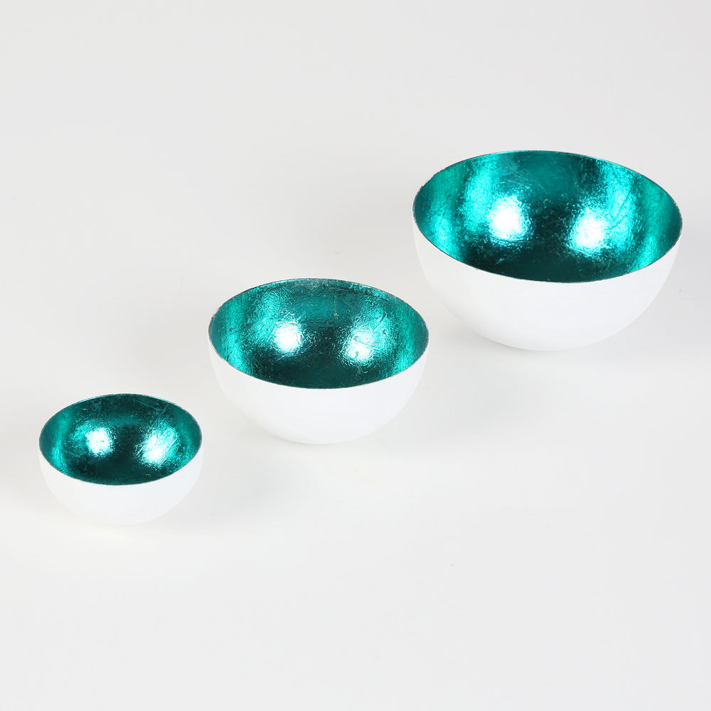Maritime Momente für jeden Tag. Das elegante Set besteht aus drei unterschiedlich großen Teelicht-Schalen, die aus robustem Metall gefertigt und von Hand veredelt wurden. Die Außenseite besticht durch ein edles Weiß, während die Innenseite in einem glänzenden Türkiston verziert ist. Dieses außergewöhnliche Design bringt eine frische und maritime Note in Deine Wohnräume!
