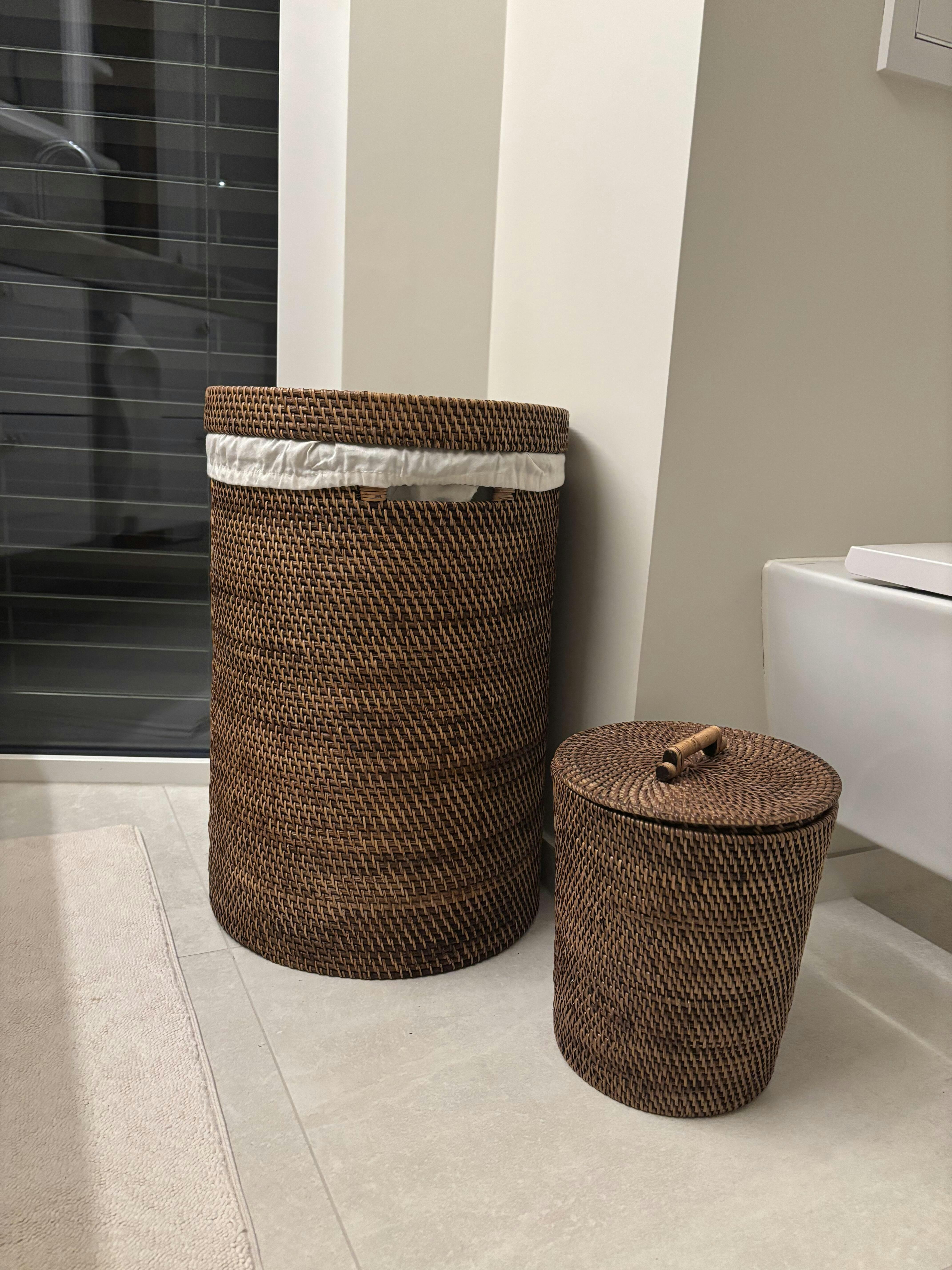 Der Rattan-Wäschekorb Cleo Braun mit abnehmbaren Deckel wurde aus 100% Natur-Rattan handgeflochten, sodass sie eine naturfreundliche Aufbewahrungsmöglichkeit haben. Diese rustikal geflochtenen Körbe sind natürlich, schön, robust und sind somit ideal für die Aufbewahrung und Dekoration. Der runde Rattan Wäschekorb bietet genügend Platz, um Ihre schmutzige Wäsche ordentlich zu verstauen. Das kunstvolle Flechtmuster unserer Rattan-Wäschekörbe in Naturtönen verleihen jedem Raum ein mediterranes Ambiente, und werden garantiert Blicke auf sich ziehen. Das Innere des Wäschebehälters ist mit herausnehmbarem Baumwoll-Textil ausgekleidet, und dank der integrierten Griffe können Sie den Rattankorb leicht von Raum zu Raum tragen.