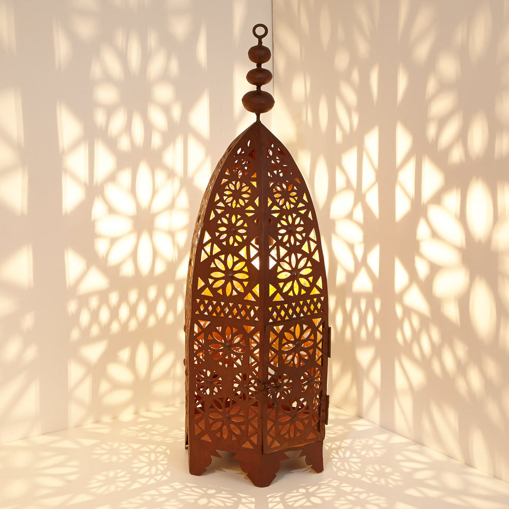 Diese orientalische Laterne sorgt für ein faszinierendes Licht-/Schattenspiel. In kunstvoller Handarbeit wird das Metallgerüst mittels Techniken wie Ausschnitt oder Gravur mit filigranen, orientalischen Ornamenten verziert. Mithilfe eines Riegels lässt sich eine Seite aufklappen, um das Leuchtmittel zu platzieren. Es kann sowohl elektrische Beleuchtung als auch Kerzenbeleuchtung verwendet werden.