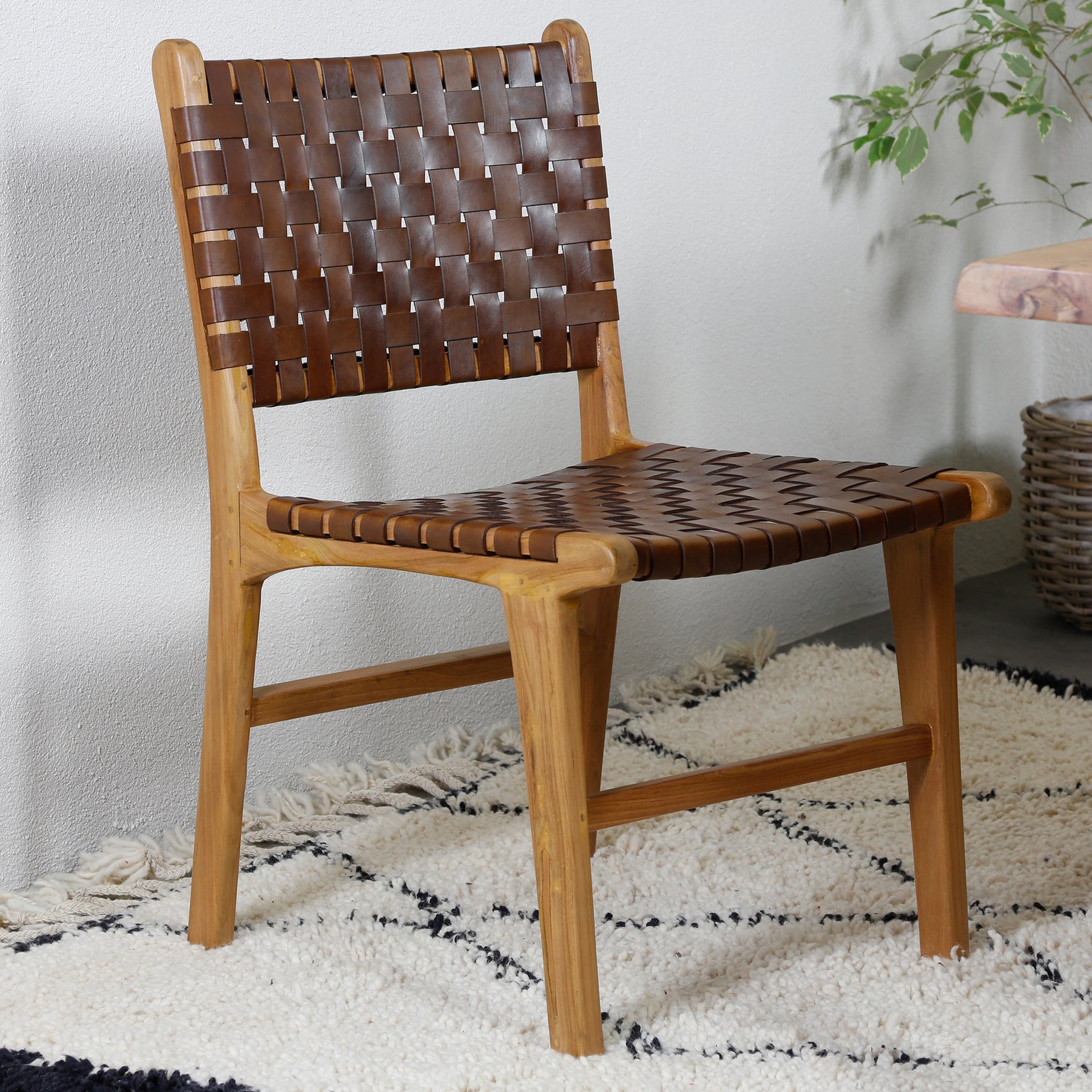 Mehrzweck- und Esszimmerstuhl aus vollem Teakholz mit Sitzfläche aus Holz und echtem Leder im Flechtdesign – luftdurchlässig, stabil und elegant.