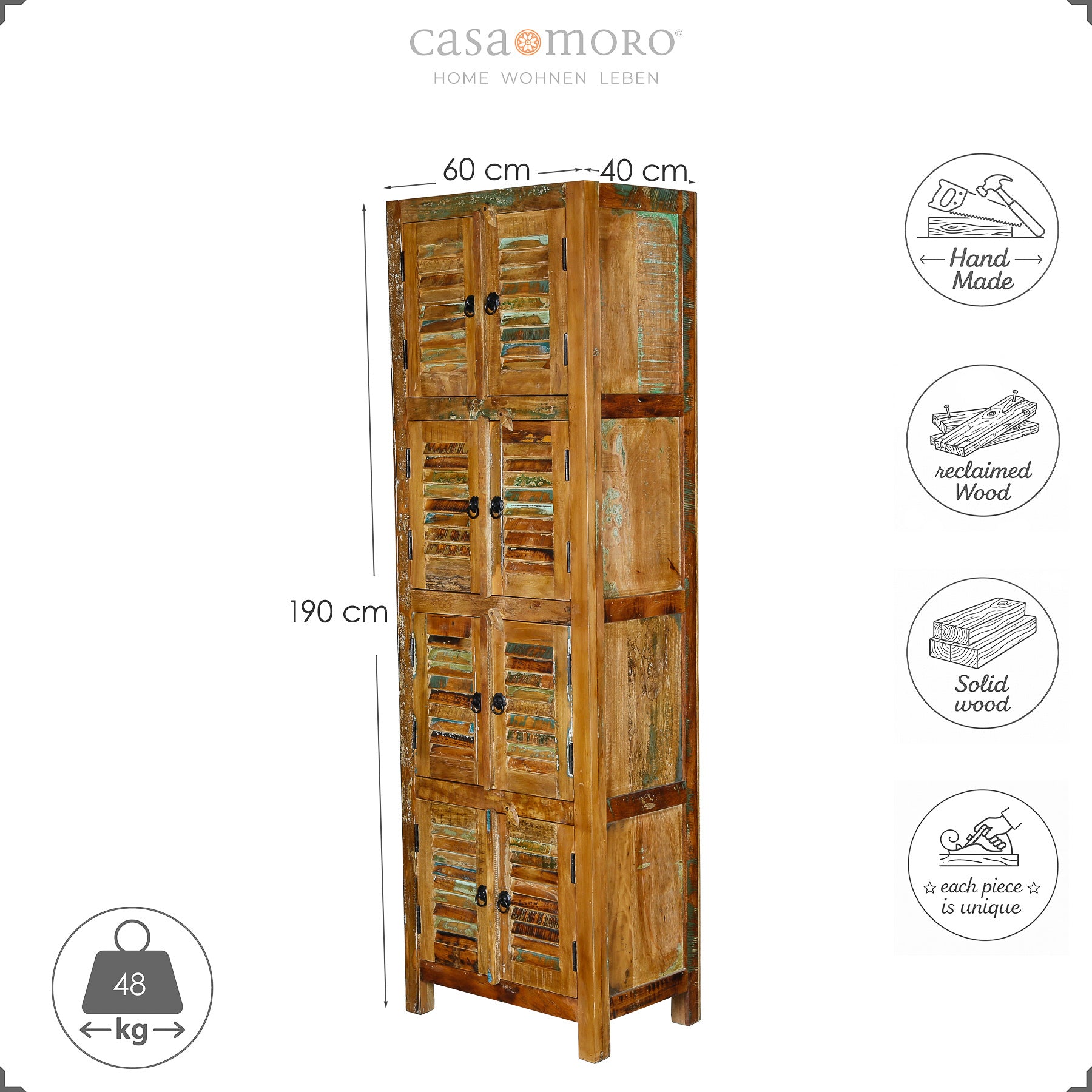 • Maße: Breite 60 cm × Tiefe 40 cm × Höhe 190 cm