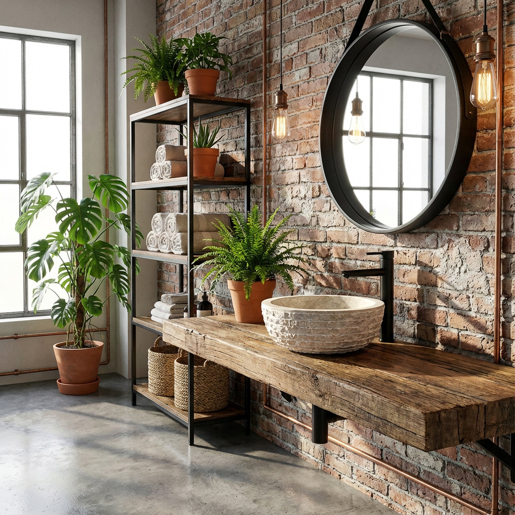 Rundes Aufsatzwaschbecken aus Naturstein mit strukturierter Oberfläche auf Holz-Metall-Konsole im industriellen Loftbad