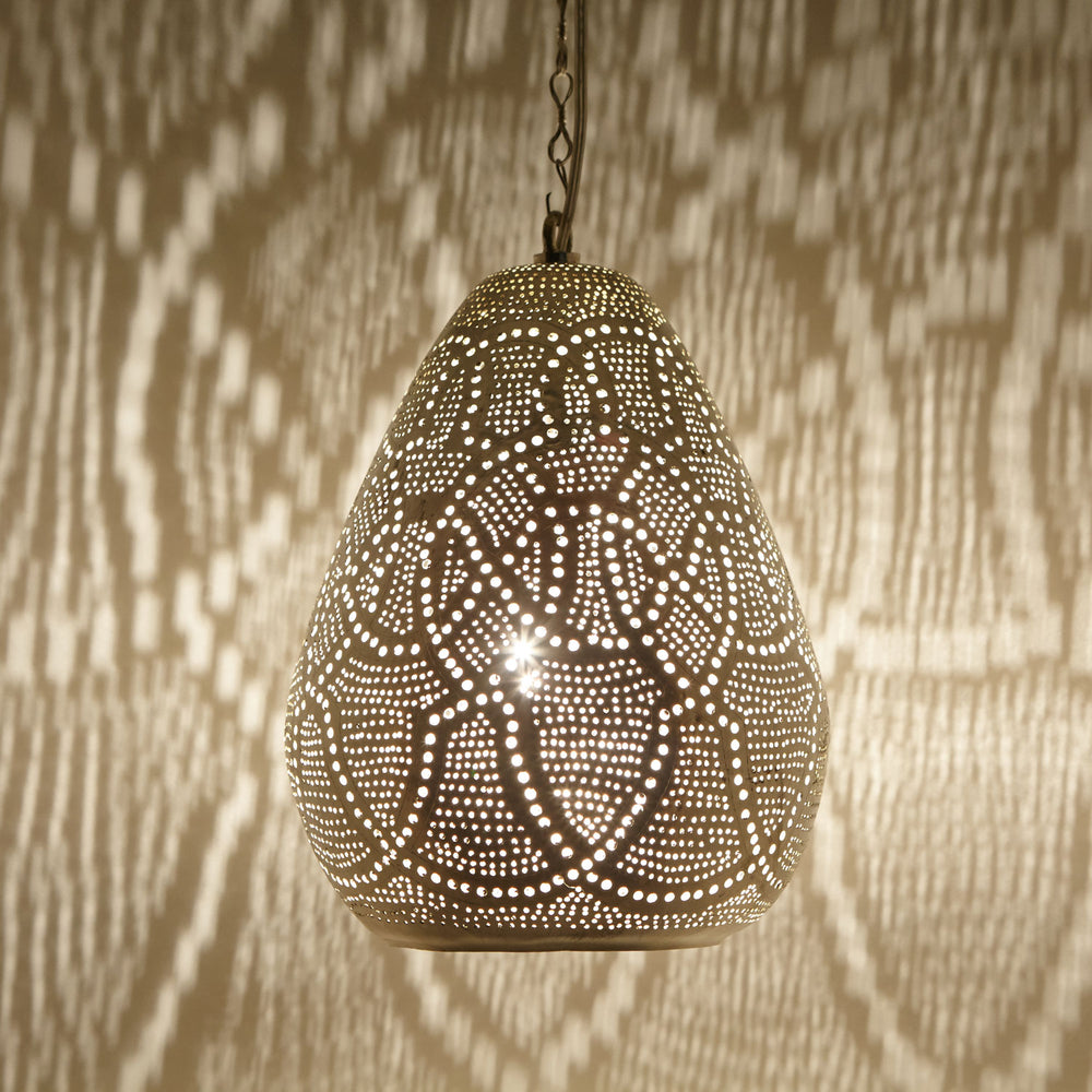 Die Hängelampe macht in jeder Ecke und in jedem Zimmer mit ihren verzaubernden Schattenwürfen eine gemütliche Atmosphäre! Ob über dem Esstisch , im Schlaf-oder Wohnzimmer, ob mediterran, orientalisch oder modern- mit unserer versilberten Ägyptischen Lampe begeben Sie sich auf eine Reise in den Orient und lassen sich verzaubern mit filigranen Schatten – ein Hingucker der in ihrem Wohnbereich nicht fehlen darf!