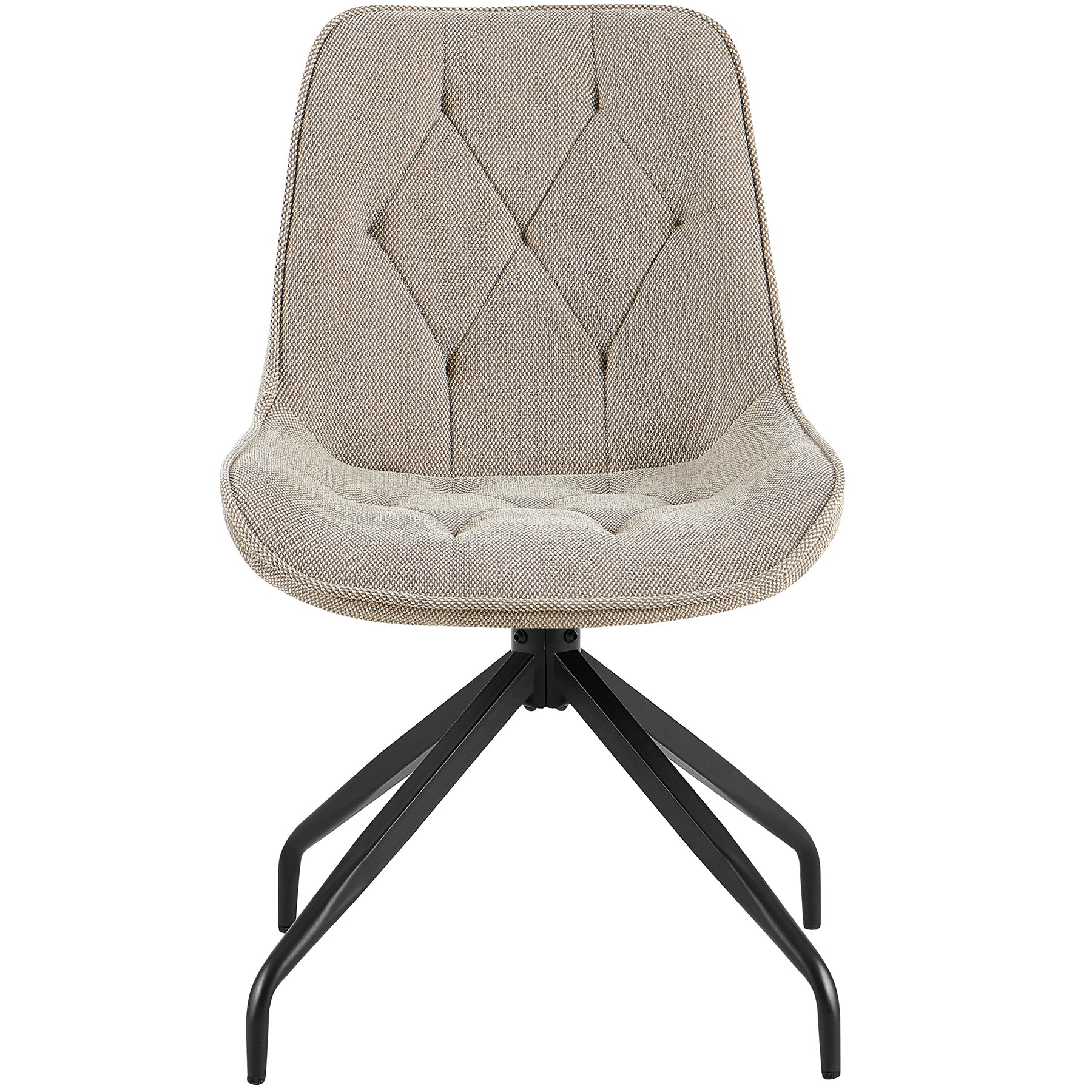 Die Sitzschale ist ergonomisch geformt und mit einer weichen Polsterung aus formstabilem Schaumstoff versehen. Der strapazierfähige Polyesterbezug mit feiner Struktur und eleganter Rautensteppung verleiht dem Stuhl eine natürliche, moderne Note. In Kombination mit dem schwarz pulverbeschichteten Metallgestell entsteht ein ausgewogener Materialmix, der zu hellen Holztischen ebenso passt wie zu dunklen, industriellen Interieurs.
