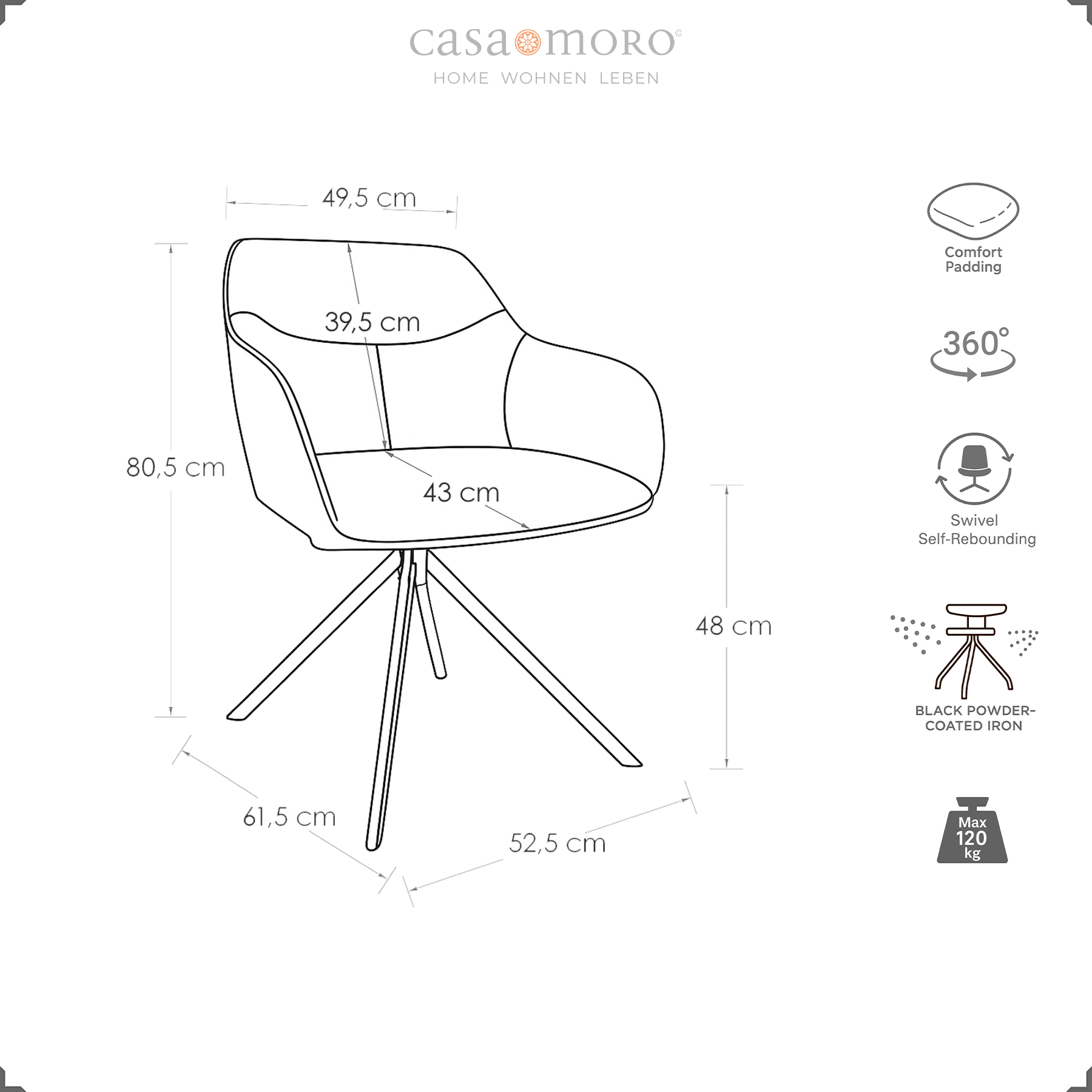 Die Auto-Return-Funktion sorgt dafür, dass sich der Sitz nach dem Aufstehen automatisch ausrichtet – der Essbereich bleibt ordentlich, der Bewegungsablauf fühlbar angenehmer. Die ergonomische Form mit Armlehnen, die weiche Schaumstoffpolsterung und der strapazierfähige Polyester-Strukturstoff mit Fischgrätmuster bieten langanhaltenden Sitzkomfort – ob beim Frühstück, fokussierten Arbeiten oder geselligen Abenden. Das schwarz pulverbeschichtete Metallgestell in Stativform verleiht Stabilität, Bodenschoner schonen empfindliche Untergründe. Mit nur ca. 6,8 kg lässt sich der Stuhl leicht bewegen und flexibel platzieren.