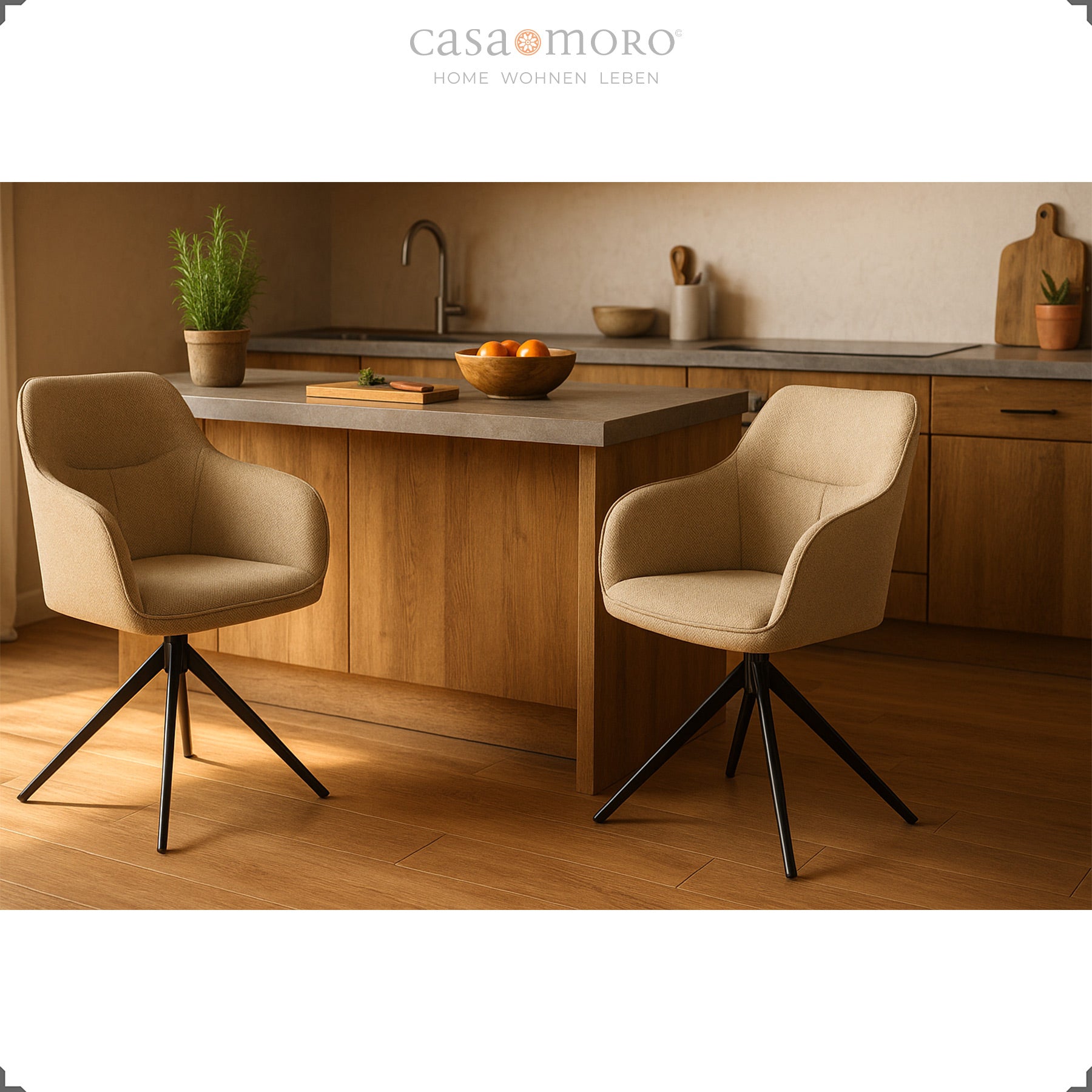 Als Esszimmerstuhl überzeugt er durch ruhige Proportionen und eine klare Linienführung, die sich harmonisch einfügt. In der Küche punktet er mit seiner 360° drehbar ausgeführten Sitzschale – ideal, wenn es schnell gehen soll. Im Homeoffice bringt der Polsterstuhl mit Armlehnen entspannte Ergonomie an den Schreibtisch, im Wohnzimmer ergänzt er Lounge-Settings als bequemer Zusatzplatz. So wird er zum vielseitigen Begleiter in jedem Alltag.