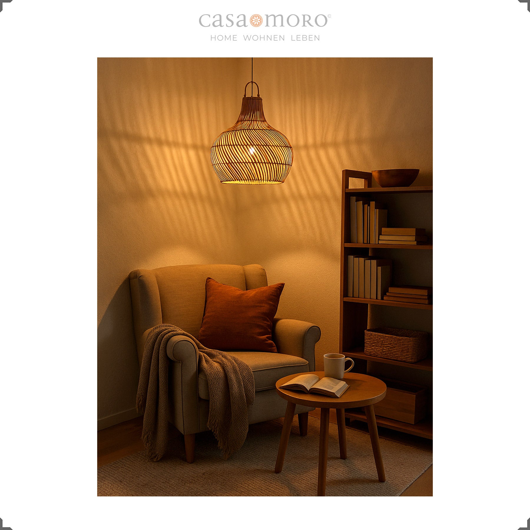 Als Pendelleuchte sorgt sie über dem Esstisch für ein harmonisches Ambiente, im Wohnzimmer für wohnliche Gemütlichkeit und im Schlafzimmer für entspannte Abendstunden. Auch im Kinderzimmer wirkt sie freundlich und leicht. Der stabile Eisenrahmen verleiht dem Lampenschirm Form und Langlebigkeit, während die helle Rattanfarbe eine warme, ruhige Atmosphäre schafft. Besonders schön wirkt das Licht mit einer klaren Glühbirne oder transparenten LED.