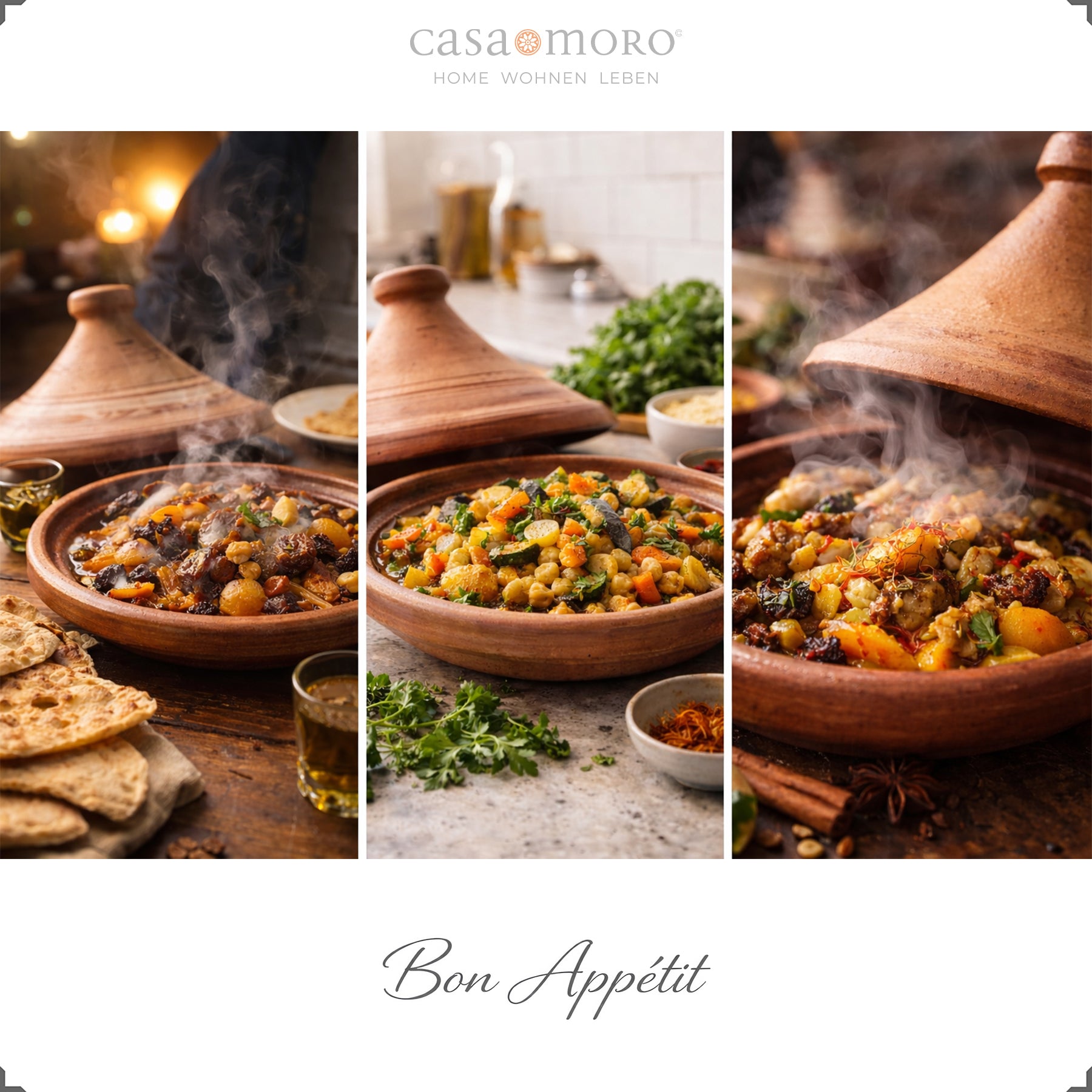 Der konische Deckel sorgt für eine natürliche Dampfzirkulation: Aufsteigende Feuchtigkeit kondensiert am Deckelhut und tropft zurück auf die Zutaten. So bleiben Gewürz und Gewürzmischung optimal erhalten. Ob marokkanisch inspirierte Rezepte mit Lamm, Hähnchen oder Fisch – oder vegetarisch zubereitete Gerichte mit Gemüse und Hülsenfrüchten – die Tajine entfaltet Aromen besonders intensiv.