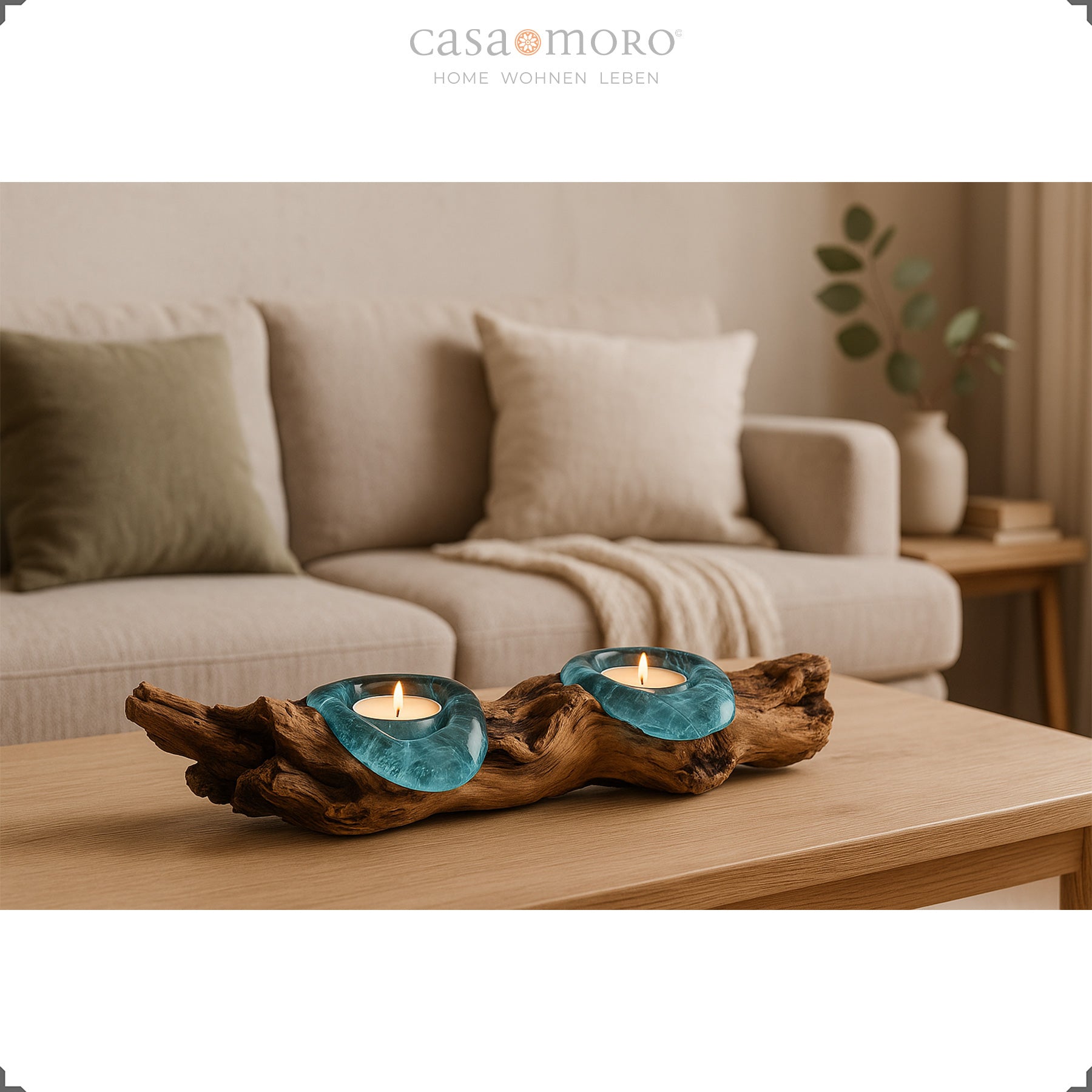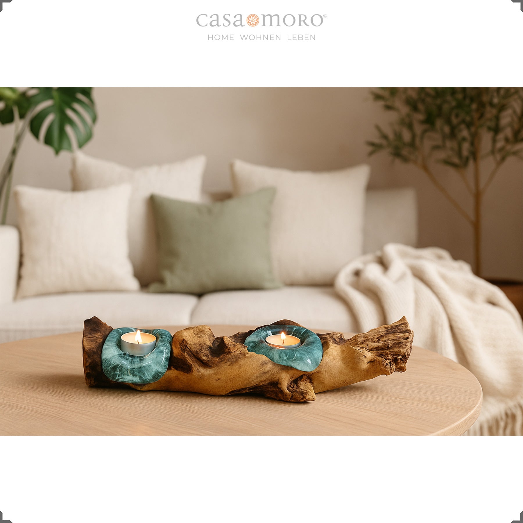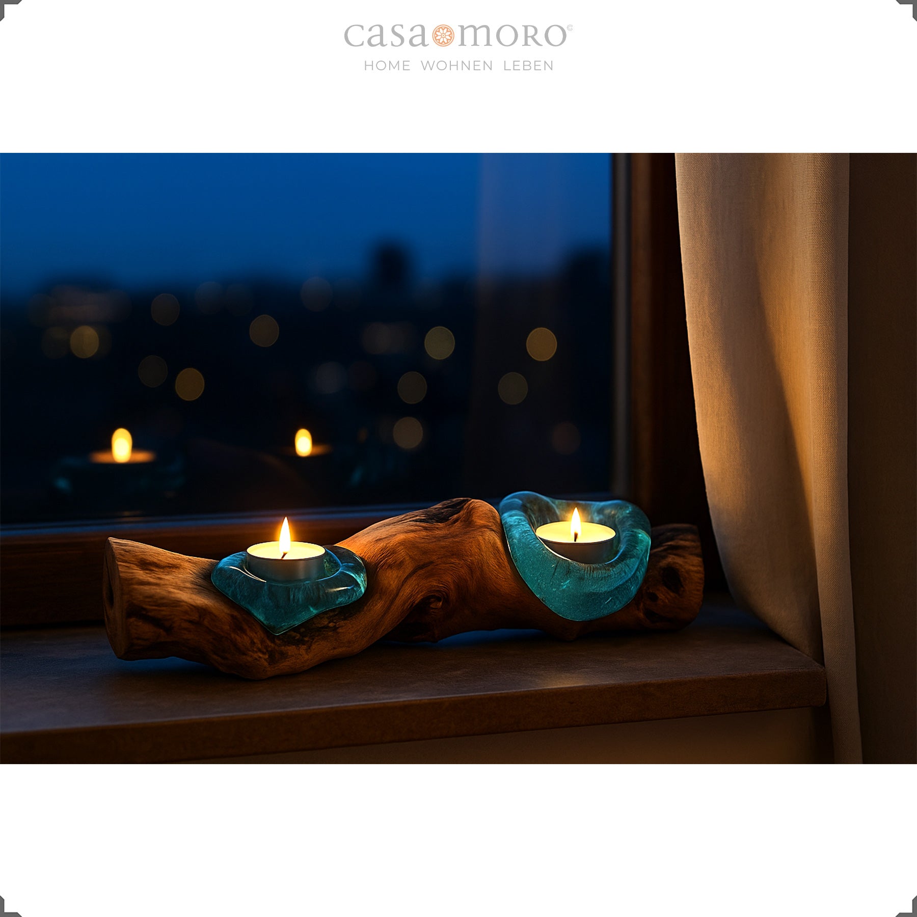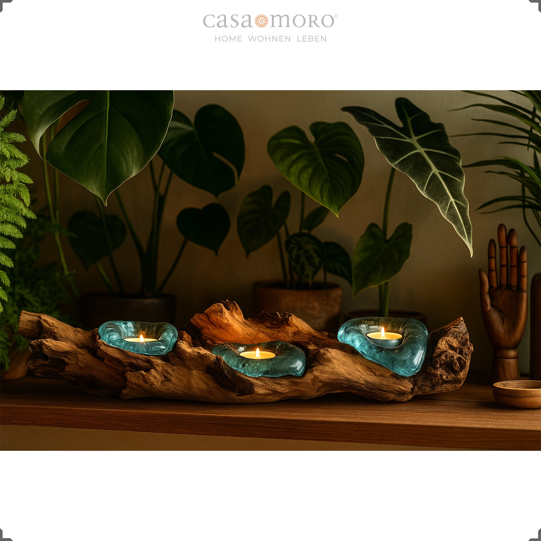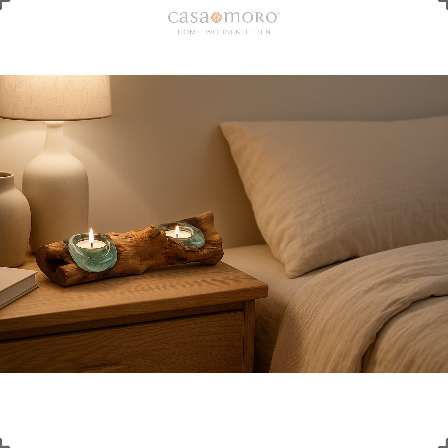 Jedes Stück ist ein Unikat: Struktur, Maserung und Form des Wurzelholz fallen immer anders aus, ebenso die feinen Schlieren und Einschlüsse im Glas. Genau diese Besonderheiten machen den Charakter dieses Teelichthalter so besonders. Ob als zentrierende Tisch Deko, auf dem Sideboard im Wohnzimmer oder auf der Fensterbank im Schlafzimmer – das Arrangement fügt sich mühelos in moderne Naturstile, Boho-Interieurs oder Scandi-inspirierte Räume ein.