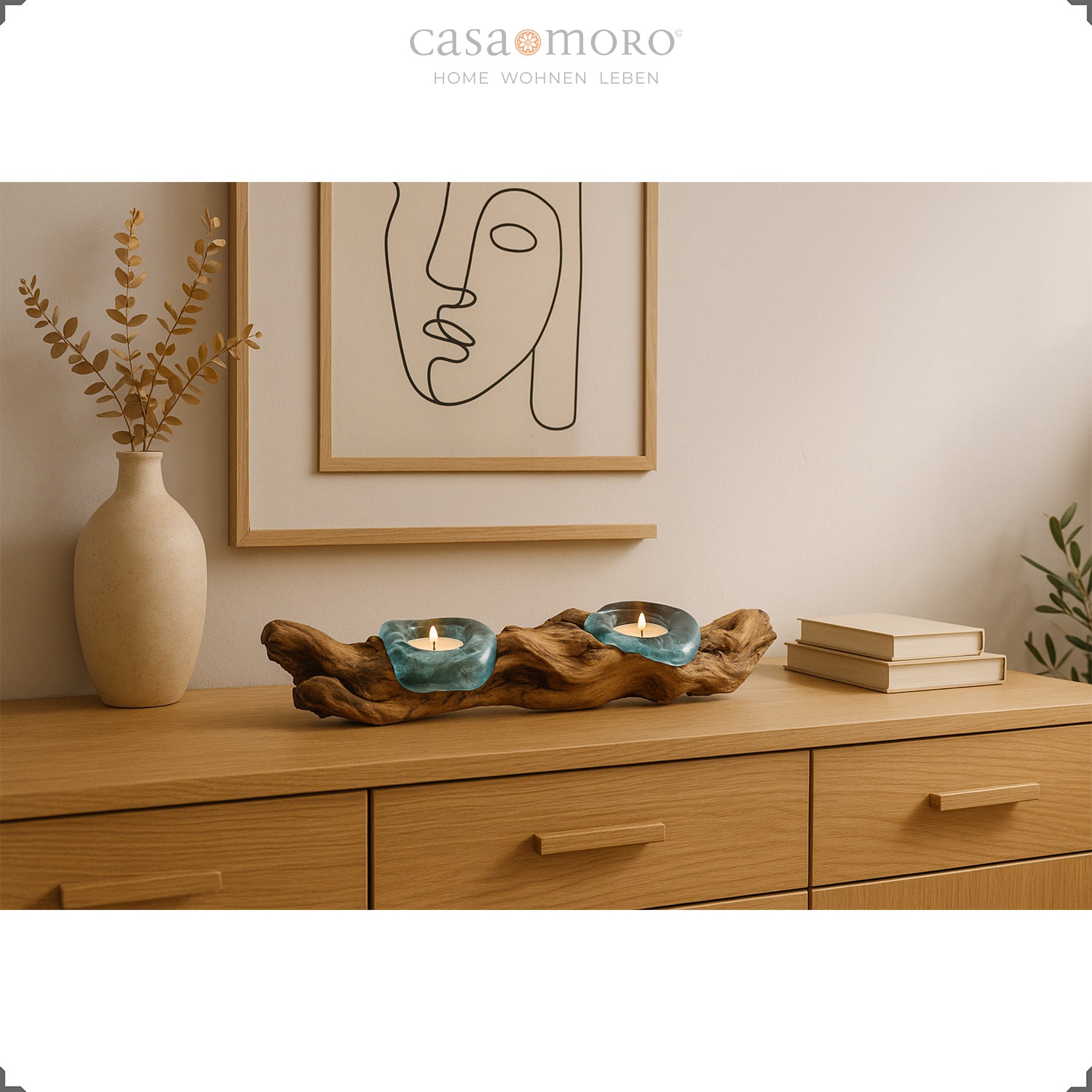 Länglicher Teelichthalter aus Glas und Wurzelholz auf einem Sideboard, sein sanftes Licht ergänzt die natürliche, moderne Wohnraumgestaltung.