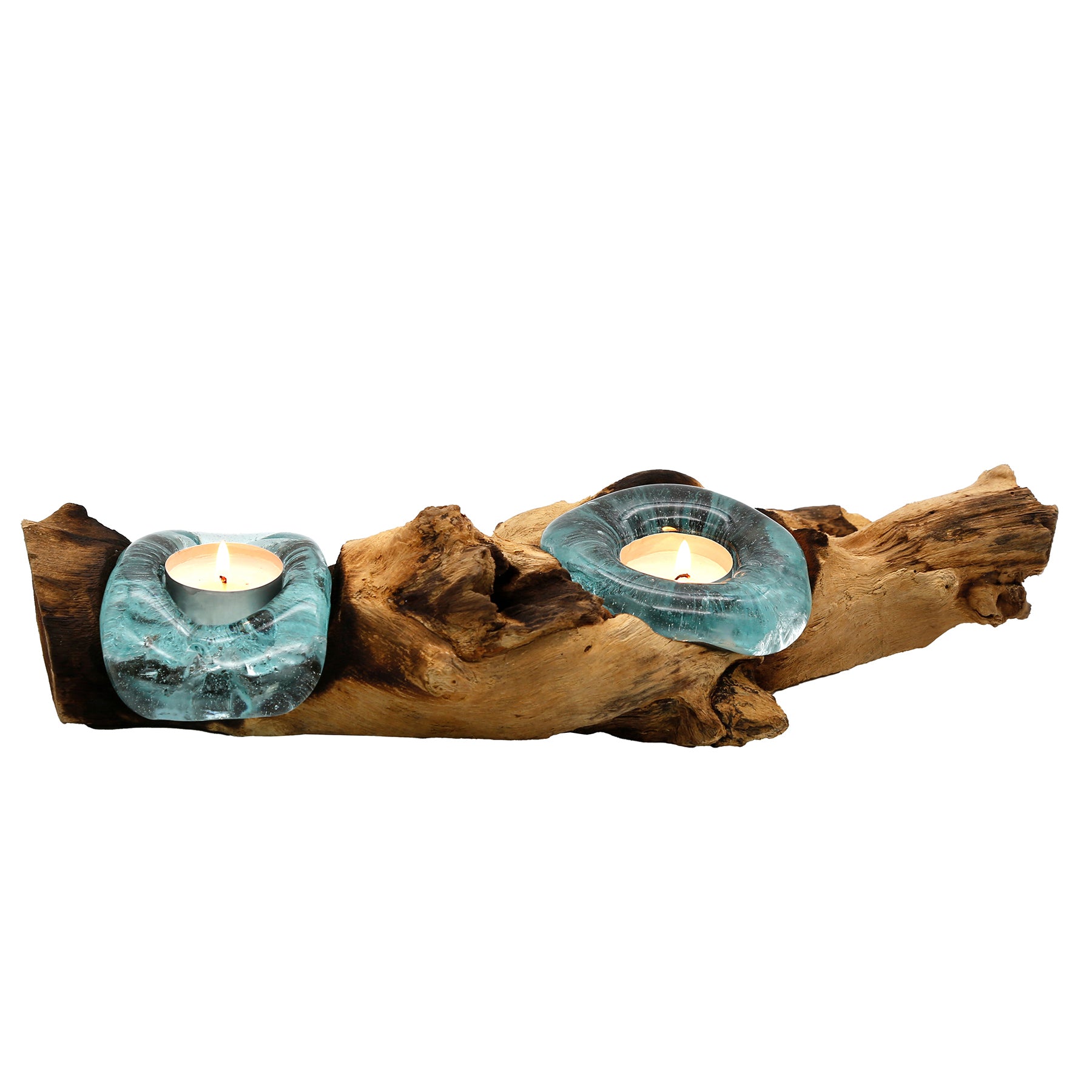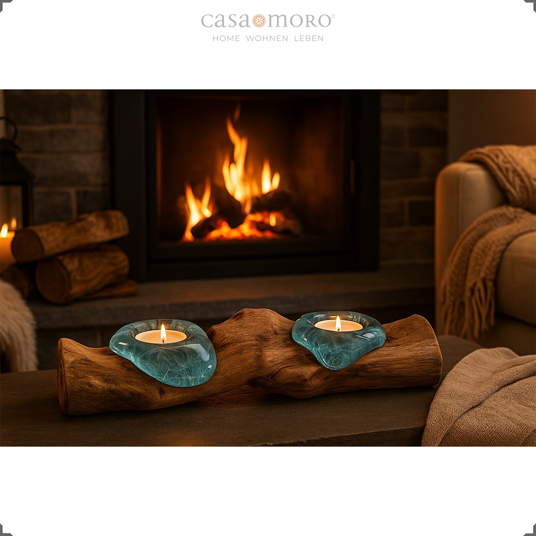 2er Teelichthalter aus Glas und Holz, der Wurzelholz in Szene setzt