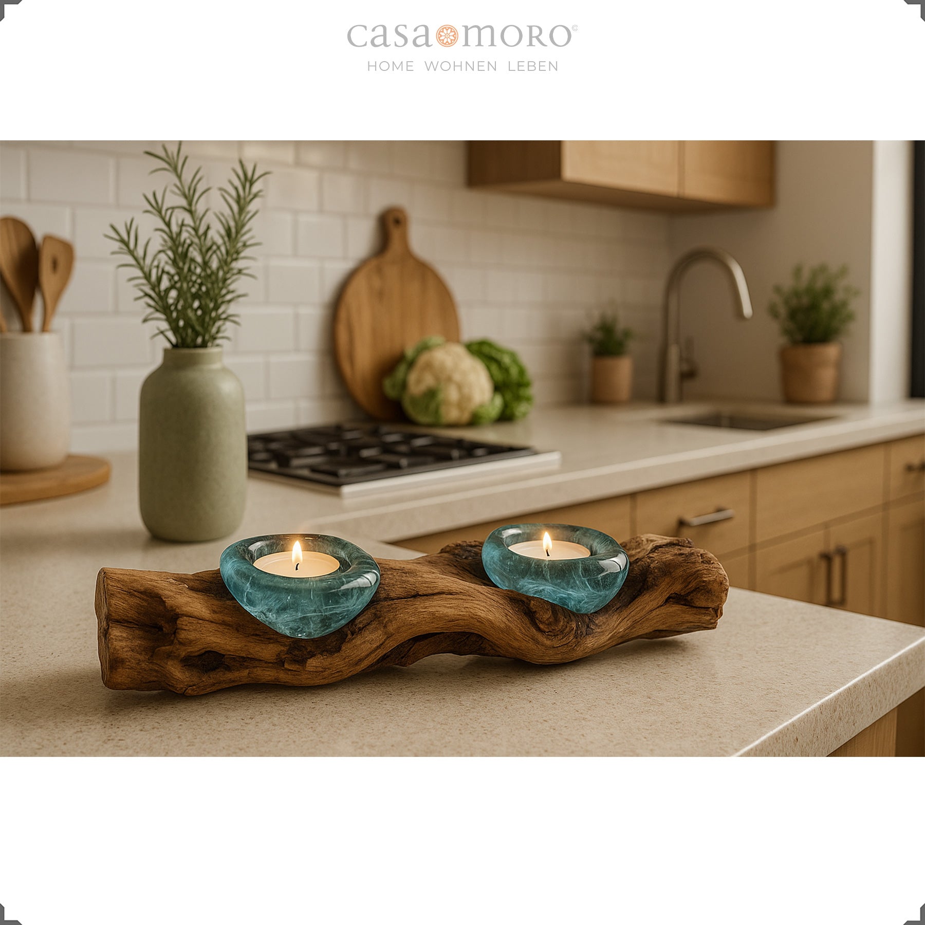 2er Teelichthalter aus Glas und Wurzelholz auf einer Küchenarbeitsplatte, sein warmes Licht setzt einen natürlichen, ruhigen Akzent.