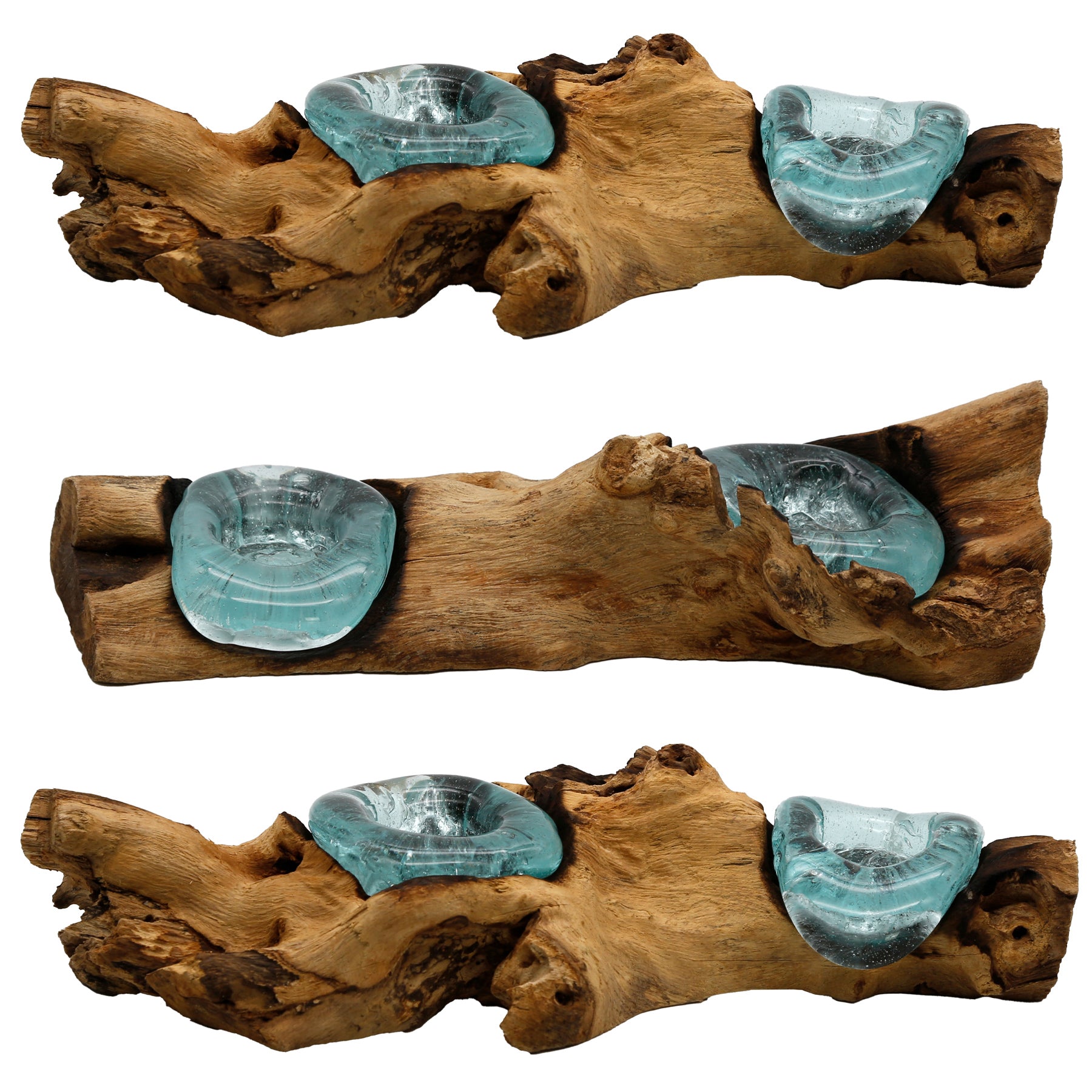 Die Glaseinsätze werden im heißen Zustand direkt auf den Teakholz Stamm gelegt und passen sich dabei den organischen Linien des Holzes an. So entsteht ein Teelichthalter aus Glas und Holz, dessen geschwungene Holzschale wie eine skulpturale Deko wirkt und das Kerzenlicht weich reflektiert. Das Zusammenspiel von Glas und Wurzel-Holz schafft eine ruhige, warme Atmosphäre – ideal für gemütliche Abende.