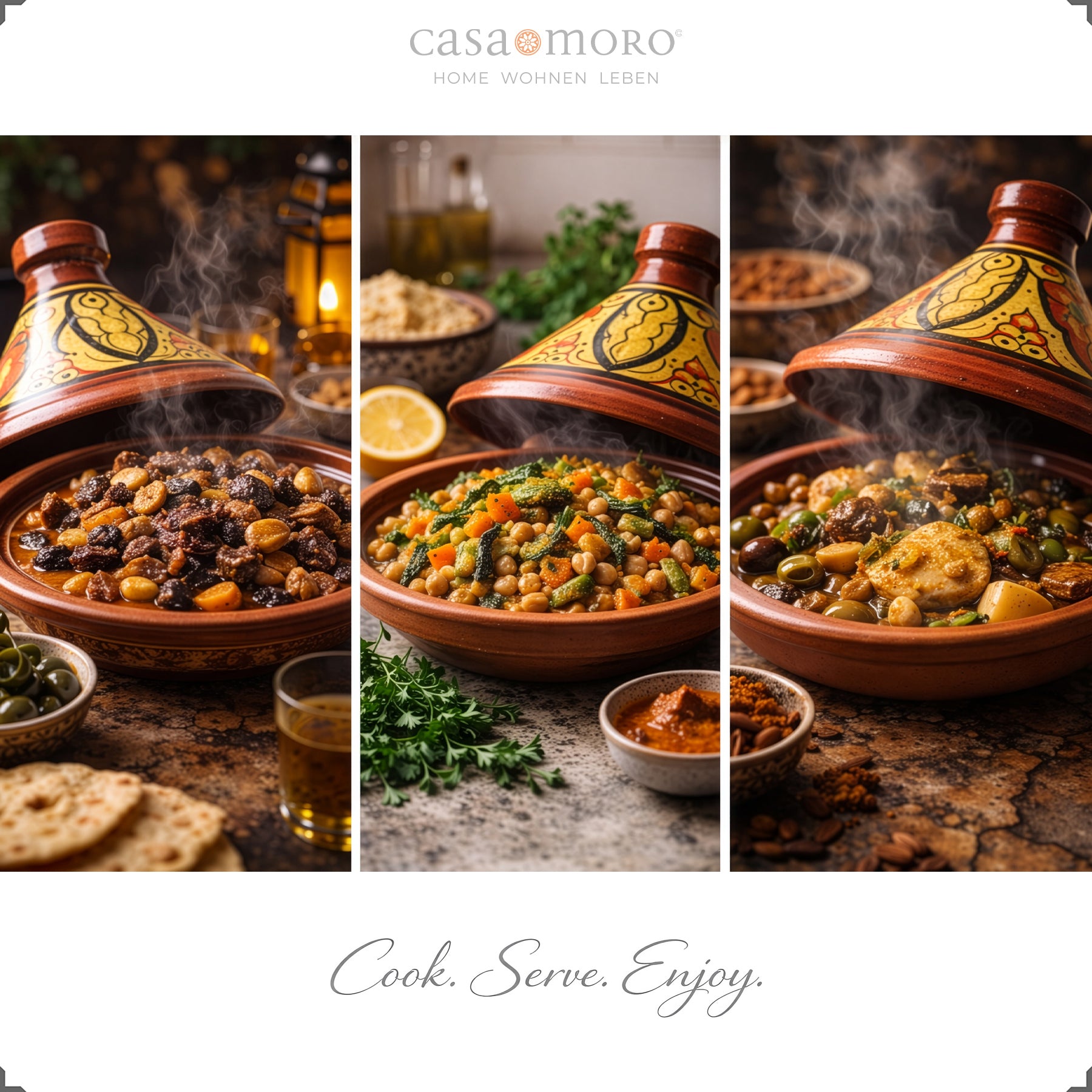 Die Glasur macht diese Tajine besonders angenehm im täglichen Gebrauch: Sie ist leicht zu reinigen, wirkt hochwertig und unterstützt eine saubere, klare Aromatik. Gleichzeitig bleibt das Kochen typisch marokkanisch: langsam, duftend und mit dem Gefühl, dass die Zutaten „Zeit zum Werden“ bekommen.
